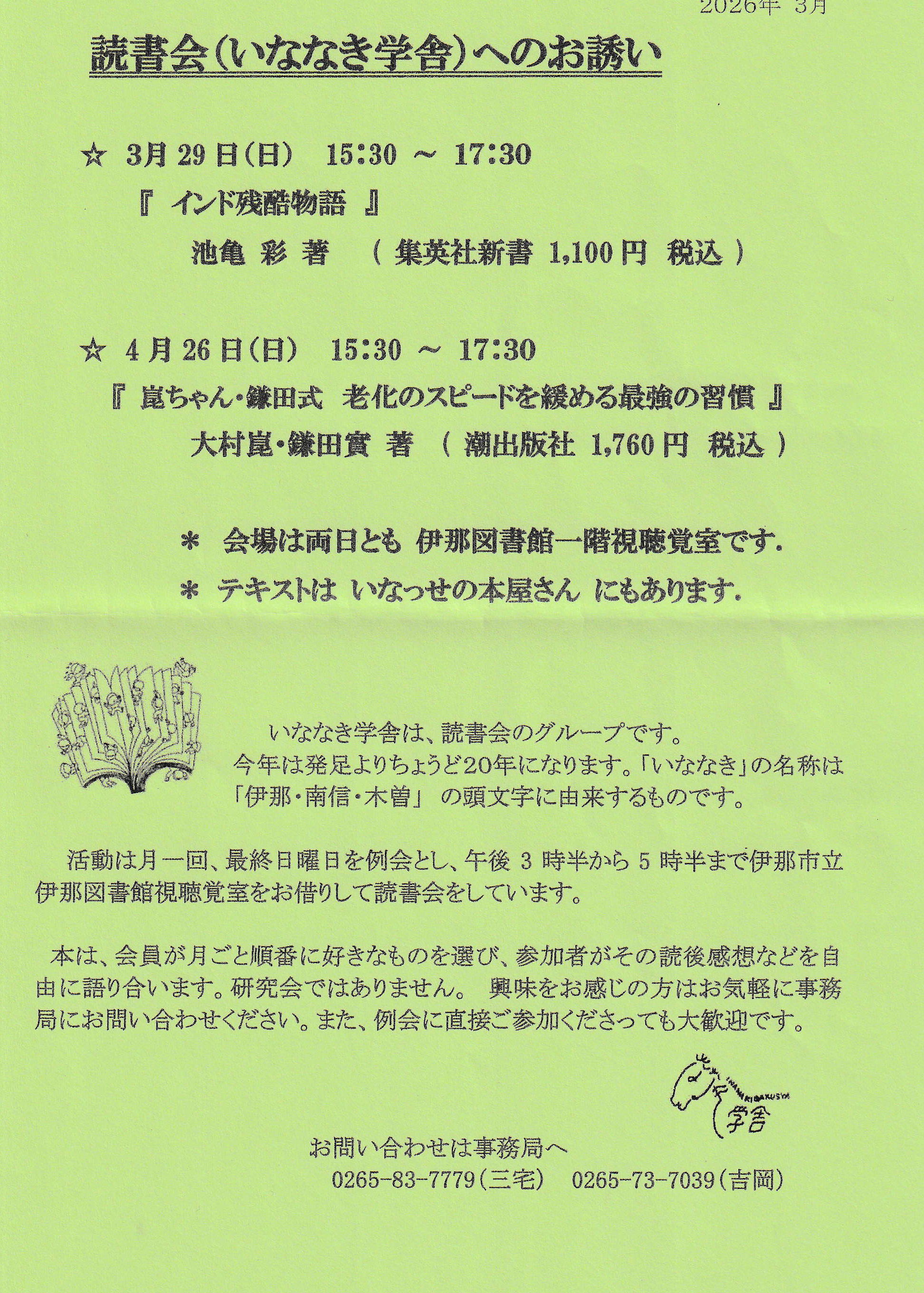 2020年「いななき学舎」発足15年となりました。記念して15年の歩みを発行しました ![]() ☆「いななき学舎15年の歩み」編集に際して いななき学舎代表 六波羅秀紀 「いななき学舎」の発足は2005年8月、代表は森本尚武さん、事務局は有賀功さんと若林敏明さん。設立の目的は @地域に根差した活字文化の振興をはかる。 Aそのために読書会、講演会等の活動を行う。 B「信州岩波講座」の伊那での開催を目指す。というものでした。「信州岩波講座」は岩波書店、信濃毎日新聞社、須坂市等の支援のもとに、須坂の市民団体が毎年夏に須坂市メセナホールを会場として、ひと夏に4回、全国の著名な講師8〜10人が講演しています。松本市でも同地の民間団体が年1回、講演会を開いています。いななき学舎でも当初、有名講師をお迎えして講演会を行いましたが、会費2,000円で運営する私たちに、どこからの支援もなく著名な方々をお招きするには千円のチケット販売での実施でした。 このチケット販売は大変で結局止めになり、その後は、会員や費用の少なくて可能な方々の講演会を実施しています。また、読書会は当初より毎月1回行われ、現在に至っていますが、須坂や松本ではないそうですから、読書会はいななき学舎の特質すべき活動かもしれません。 私が参加したのは2007年であり、その時のテキストは半藤一利著『昭和史戦後編』平凡社で、有賀功さんが解説する形で進められ、一冊のテキストに数か月かけていました。当時は読書会の会場はカフェ・アビエントでしたが、2009年6月より創造館に変わり、更に2013年9月より、伊那図書館になりました。有難いことに、どこも私たちの活動に理解を示してくれ協力的で、有難いことです。2009年2月から有賀功さんに代わって六波羅が事務局に入り、有賀さんは副代表として、実質、会の運営に当たりました。2014年には有賀功さんが代表、伊藤一夫さんが副代表、事務局に六波羅、白田信隆さん、伊藤岬さん、三宅生郎さん、清水吉治さん、湯沢文象さんが入り、順番に「会員通信」を発行し、伊藤和義さんが会計担当になりました。テキストは会員が順番に決めており、2019年3月より、テキスト選定者が「会員通信」も発行することになりました。東京から参加されている方や、海外生活の長かった方もおります。大学で教鞭を執っておられ、定年退職後に参加された方もおり、会員は多彩です。信濃毎日新聞社には2006年に主筆の中馬清福さんに講演して頂き、2013年のフォーラム「東日本大震災から見えてきたもの」では編集委員の増田正昭さんがパネリストとして参加、更に来春には『芦部信喜 平和への憲法学』の著者・渡辺秀樹さんを迎えての公開読書会が予定されるなど、大変お世話になっています。 2020年は会が発足してから15年目になり、取り上げた本は約150冊になります。この9月のテキスト・出口治明さんの『還暦からの底力』の中に、沢山の人に会い、沢山の本を読み、いろいろな所に出かけて行って刺激を受ける。つまり「人・本・旅」の生活からアイディアは生まれる旨の記述がありますが、私たちの読書会はまさにその通りの活動です。アイディアが生まれたかは別として、一茶の柏崎、良寛の出雲崎、軽井沢の軽井沢高原文庫、大伴家持が越中国守として赴任した富山県の高岡市万葉歴史館、多くの文学者ゆかりの鎌倉にある鎌倉文学館、島根県松江市の小泉八雲記念館、会津、日本最古の学校・足利学校等々を訪れています。 さて、私も今年傘寿、腰は痛くなるし、記憶力もおかしくなり、複数の仕事をこなすことも困難になりました。その様な訳で同じく傘寿の伊藤和義君とともに、世代交代することになりました。それには今までの活動を記録として残して引き継ぐ事が必要ということで、今回の「いななき学舎15年の歩み」の小冊子作成することになりました。 私がなんとか代表として務められたのも、足を引っ張るような人はおらず、善意の会員の皆様の協力があったからこそであり感謝しています。 新しい代表の中堀謙二さん、会計の吉岡郁子さん、継続の事務局・伊藤岬さん、三宅生郎さんに対しましても、同様のご協力ご支援をよろしくお願い致します。 ☆伊那図書館といななき学舎 伊那市立伊那図書館 館長 北原善昭 いななき学舎15年の歩みの記録に寄稿依頼をいただき、私でいいのかという思いで記しております。 2005年(平成17年)8月にいななき学舎は設立されましたが、当時、伊那市は市町村合併に向けて慌ただしい時期だったと記憶しています。伊那図書館は伊那市にある唯一の図書館でしたから、それが合併をすると高遠町にも図書館があり、その在り方について議論を重ねていたと聞いています。合併後も現状のままでいいということで落ち着き、今に至っています。