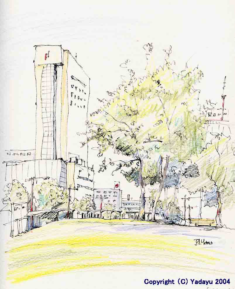 105. 札幌大通り公園 出張先で、カバンにスケッチブックをしのばせて描いた一枚。 水が使えないので色鉛筆で彩色。ちょっとちがった雰囲気になりました。 |