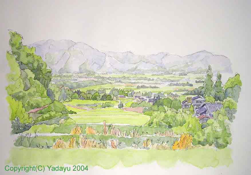 安曇野の広がりにいると、緑色のリズムを感じます。 水田の淡い緑と集落の針葉樹の深い緑が、 コントラストを作っていて、代表的な日本の風景では ないでしょうか。 |