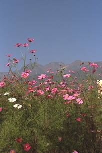アルプス花の道のこすもすです。こすもす畑が広がる一角から山をのぞきました。晩秋の風が吹いています。