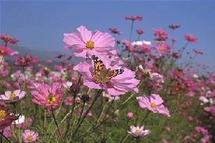 晩秋の風の中でコスモスが咲き、そして蝶が花から花へと最後の舞をしています。音の少ない静かな光景です。青い空と花・・秋の1日です。