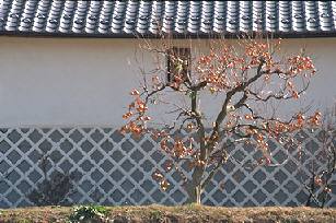 風も冷たくなり、柿の葉も全て落ちて柿の実だけが静かに木にしがみついています。田圃の向こうの蔵を後ろに静かな初冬の光景でした。あぜ道を子供が通っている風景が想像されるような、静かな初冬の晴れた1日の景色です。
