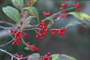 家の玄関脇のウメモドキです。輝くばかりに赤い実が充実しています。葉は少しずつ落ちていきますが、この赤い実だけはもう少し冬が来るまで残っています。