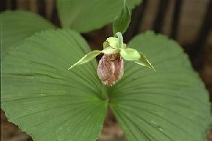 野生ラン「熊谷草」です。袋のような花を抱えてひっそりと日陰で咲きます。今では貴重な植物になってきています。気むずかしい面も少々ありますが、毎年咲いてくれます。