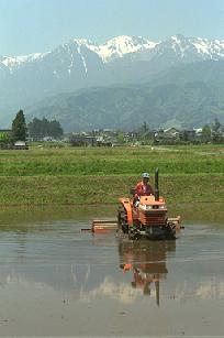 家からほんの数分の場所です。水田に映った南駒ヶ岳をトラクターが耕して?いきます。田植え直前の整備にかかるところですが、本当に暖かくなった5月の休日の1コマです。静かな中にトラクターの音が響いていました。(1997.5)
