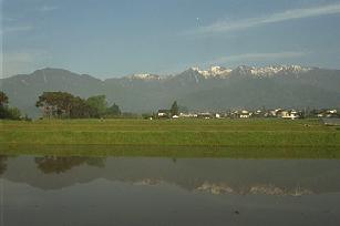 上と殆ど同じ場所からですが、静かな水田の水面が本当に鏡になり、静かにその姿をたたえています。春の静かな風の中で、ゆっくりと雪が解けていく姿を麓に本当にゆっくり見せてくれています。(1997.5)