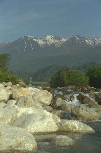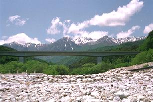 上の画像とはまた違った日に、少し違った場所から。河原をカメラのバッグを背負って歩くと、まるで散歩をしているような感じになり、のんびりしました。これが飯島町の川「与田切川」(よたぎりがわ)です。今年も南駒ヶ岳の雪解け水を運んでいます。(1997.5)