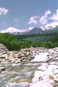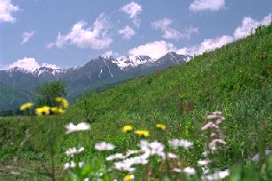 与田切川付近の田舎の「土手」です。野草が咲き、風に揺れながら、その向こうに南駒ヶ岳が綺麗に見えています。工場・車など人工的なものが入っていない風景は、落ち着くものがあります。(1997.5)