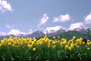 黄色のジャーマンアイリスが揃って咲いていました。その向こうには南駒ヶ岳が聳えています。花と山・・なかなかマッチするものだと思いますが。(1997.5)