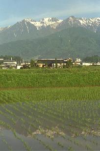 水しかなかった水鏡から、苗も植えられて苗の間の鏡になりましたが、それでもその間に南駒ヶ岳の姿が入り込んでいます。これからは、この苗がどんどん大きくなって、もう水田には南駒ヶ岳も映らなくなっていきます。(1997.5)