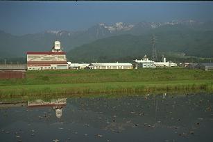 水がたたえられ、わずかな睡蓮の浮かぶ田に山がうっすらと浮かび、カントリーの向こうには霞の中に南駒ヶ岳が聳えます。雪も少しずつとけて、春から夏への準備を山も始めました。(1997.6)