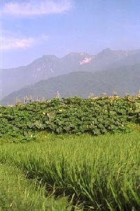 田の稲もすっかり成長し、あとは穂が出るのを待つだけです。そして土手にはカボチャのつるがびっしりとはってところどころに黄色の花を咲かせています。そしてその奥に悠然と南駒ヶ岳。夏の景色です。(1997.7)