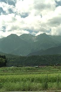 稲穂がしっかりしてきました。奥には雲のかかった南駒ヶ岳が見られます。(1997.8)