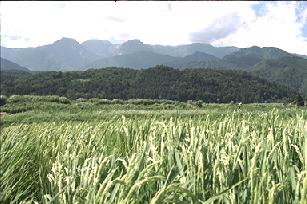 麓の田は稲穂も実りはじめてきました。春の苗からどんどん生長し、色も濃い緑と変わってこれからは稲穂が黄金色に変わるのみです。夏の風を受けながら山は静かに秋に向かい、麓は秋への準備を始めます。(1997.8)