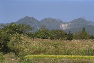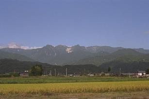 「秋高し」そんな言葉の良く似合う秋の1日。麓では稲穂がしっかり黄金色に色づき、収穫を待っています。秋の風に静かに揺れる稲穂の向こうには南駒ヶ岳が静かに座っています。いつもの事ながら秋を迎えますが、いつものことではないその年だけの秋の景色を作り始めています。(1997.9)