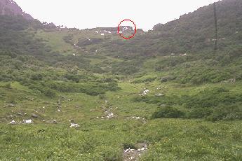 右の写真は摺鉢窪カールを稜線上、カールへの分岐点から見下ろしたものです。 上の写真は下から、稜線を見あげたもの。これは稜線からカールを見下ろしたものです。 何かあまり変わらないような錯覚に陥りますが、これもカール地形のためなのか・・とも思います。