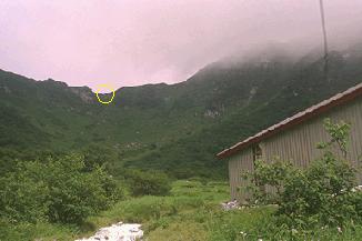 ですから、上部白く見えるところは空ではなくて、ここから先が崩落地帯となっており、この先に晴れていれば飯島町が見えるはずの部分なのです。 つまり右の写真を撮った場所は下の黄色の円で囲んである稜線上から撮影したものなのです。 |