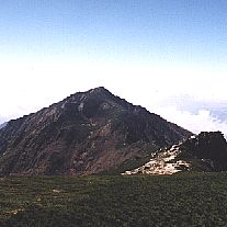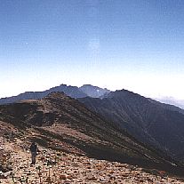 左:宝剣岳南側稜線から見る三ノ沢岳 右:南駒ヶ岳まで続く稜線 1999.10.9