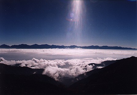(千畳敷カールより南アルプスを望む。中央遠方は富士山頂。1999.10.9 AM8:10)