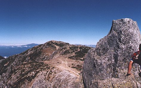 宝剣岳山頂の大岩。そして中岳山頂・木曽駒山頂、を眺める。遠方は乗鞍岳山頂 1999.10.9
