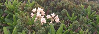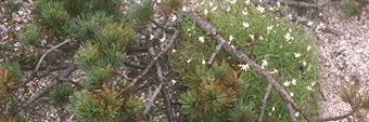 南駒の周辺にはこんな花が咲いています。(上:イワツメクサとハイマツ・下:ハクサンシャクナゲとハイマツ)。その他にもコケモモなどがあります。 いつまでもここにいたいのですがそうもいかない。グレープフルーツをしっかり食べて、もう一度周りをゆっくり味わって、我慢して下山です。振り返ると、今度いつ来られるかもわからないので、やはりどこか去りがたいものがありました。たった35分間の頂上としました。