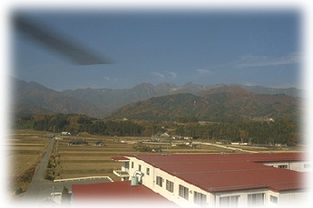 下の大きな赤い屋根は果物の選果場です。梨やリンゴなどの特産物がここに集まって品種・規格によって選別されて全国へ出荷されていく場所です。この日はここの駐車場がヘリポートになりました。西の方向、遠くに中央アルプス「南駒ヶ岳」が見えています。さあフライトです。 |