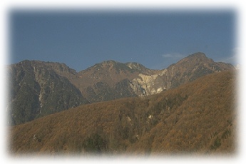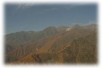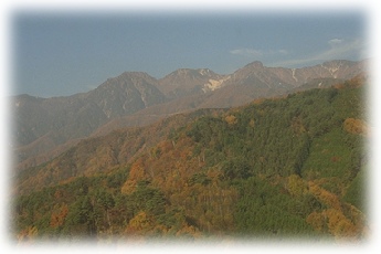 手前の山が飯島町から一番近い「里の山」です。これを越えて機体はどんどん中央アルプスに向かって行きました。里の山は紅葉がどんどん進んでいて非常に綺麗なものでした。 |