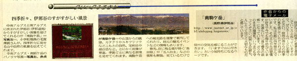 ![]() | 京都新聞 1997年5月7日 朝刊 この南駒ヶ岳ホームページを開設して以来、幾つかの新聞・雑誌そしてCDやネットなどでの紹介もしていただくことが出来たことに心から感謝しているところですが、その中でも特に、1997年(平成9年)5月7日の「京都新聞」の16面で紹介されたことは深く記憶に残る事でした。 |